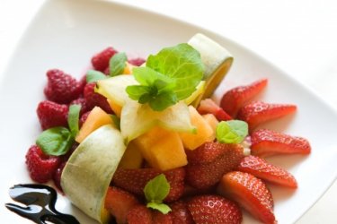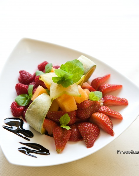 Melona przekroić na pół, wybrać gniazdo, oddzielić skórę i pokroić. Maliny i truskawki pokroić i ułożyć na talerzu wraz z melonem. Posypać miętą, przystroić karambolą i polać syropem balsamino.